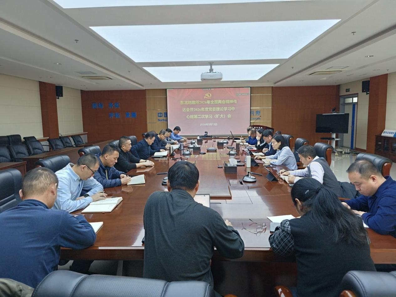 3月13日,東北地理所黨委召開全國兩會精神傳達會暨2026年度黨委理論學習中心組第二次學習(擴大)會。全國政協委員、東北地理所所長姜明傳達學習了習近平總書記在全國兩會期間發表的重要講話和全國兩會精神。所黨委委員、紀委委員、黨支部(黨總支)書記、管理和支撐部門負責人參會。黨委書記、副所長王宗明主持會議。