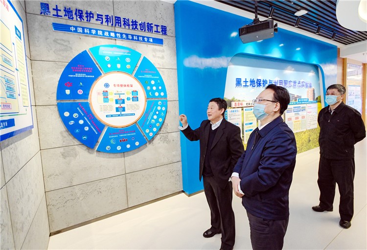 景俊海一行先后來到中科院大豆分子設計育種重點實驗室、黑土區農業生態重點實驗室實地察看科研項目進展,詳細了解最新科研成果,鼓勵科研人員加強原創性、引領性科技攻關,積極推動農業技術與人工智能、大數據等新技術深度融合,盡快在生物育種、水土流失防治、鹽堿地治理等領域實現突破。