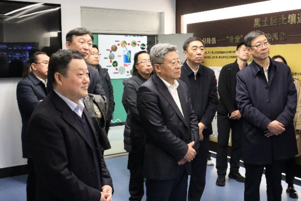 在東北亞種質資源研究中心二樓,調研組現場參觀了研究所標本館及“黑土糧倉”科技會戰(zhàn)指揮系統(tǒng),科研團隊通過動態(tài)演示及現場監(jiān)測數據,展示了“黑土糧倉”科技會戰(zhàn)組織構架及會戰(zhàn)進展,黑土地保護與利用區(qū)域適宜性技術模式及示范推廣成效。孫東生強調,需持續(xù)深化科技賦能,不斷完善覆蓋全鏈條的黑土地生態(tài)保護技術體系。