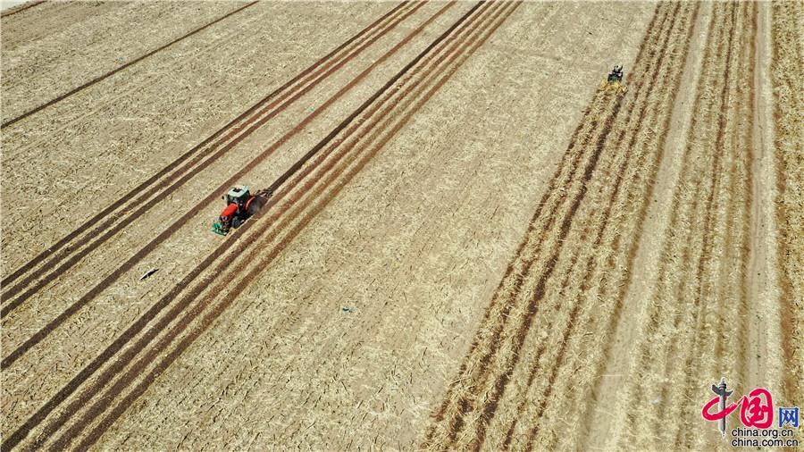 5月11日,探訪中國科學院“黑土糧倉”科技會戰“梨樹模式”示范區,“梨樹模式”研發的專用秸桿覆蓋條耕機在萬畝示范區現場作業。中科院科技攝影聯盟供圖