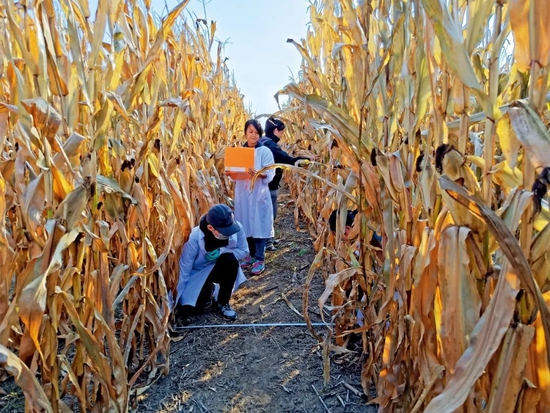 中科院沈陽應用生態研究所張旭東研究員團隊成員在保護性耕作研發基地測玉米產量。