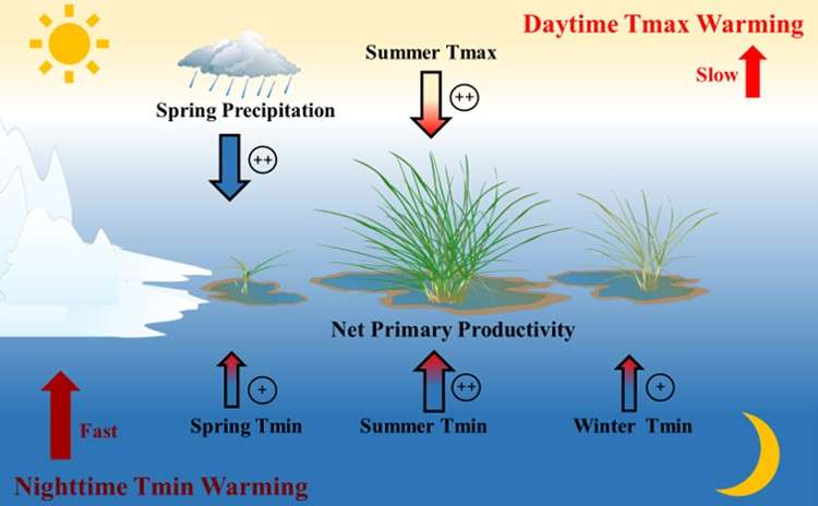 研究發(fā)現(xiàn),白天和夜晚升溫對(duì)青藏高原沼澤濕地植被NPP具有不對(duì)稱的影響。冬季和春季夜晚升溫能夠通過減少凍害的發(fā)生,在一定程度上增加青藏高原沼澤濕地植被NPP。在夏季,白天和夜晚升溫均會(huì)導(dǎo)致植被NPP顯著升高。