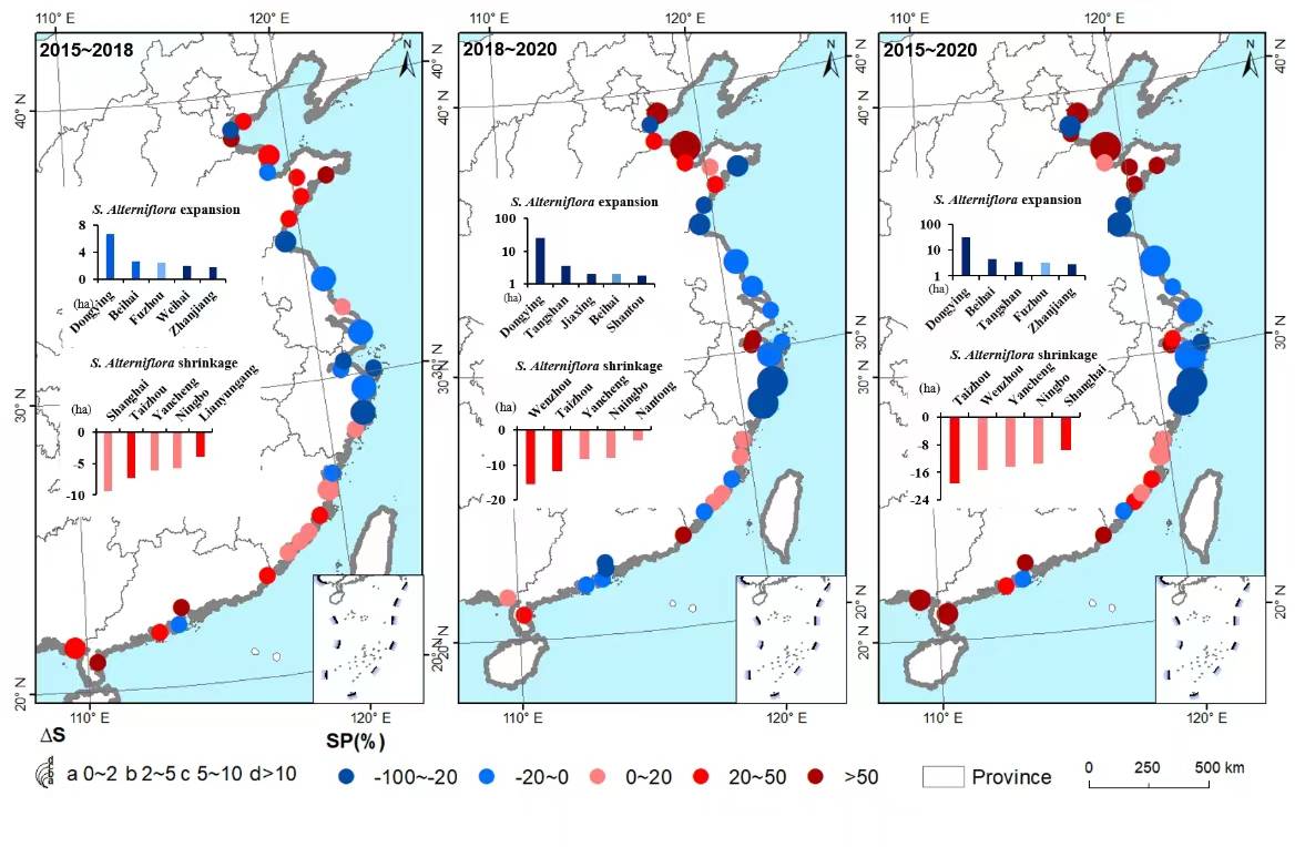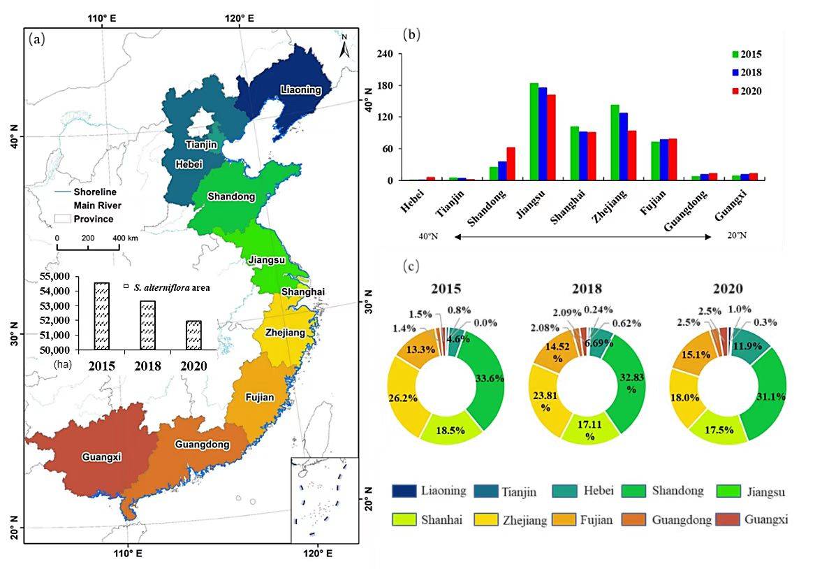 圖1. 2015、2018和2020年中國沿海省份互花草入侵情況(a)、各省互花米草面積變化(c)、各省互花米草占比。