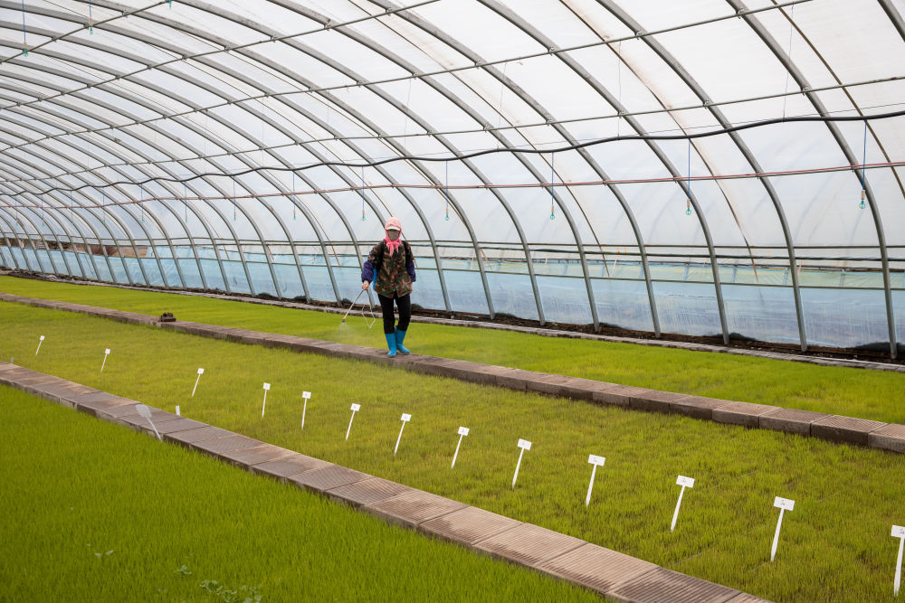 在黑龍江省慶安縣東禾久宏現(xiàn)代農(nóng)業(yè)水稻示范園區(qū)育秧大棚內(nèi),農(nóng)民在進行秧苗養(yǎng)護(4月26日攝)。新華社記者 張濤 攝