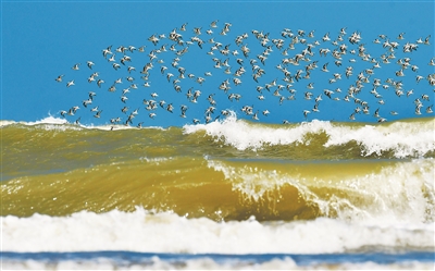 群鳥在閩江河口濕地海面上翱翔。新華社記者 魏培全攝