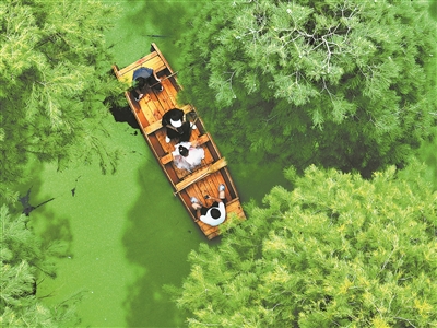 游客在江蘇省揚(yáng)州市江都區(qū)淥洋湖濕地公園的水上森林乘船游覽。新華社發(fā)(孟德龍攝)