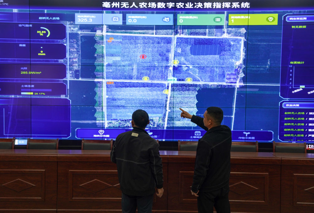當下,在安徽省亳州市譙城區智慧農場里,“90后”新農人焦瑞端坐在調度大廳內,通過近200平方米的智慧大屏將農作物的長勢盡收眼底。