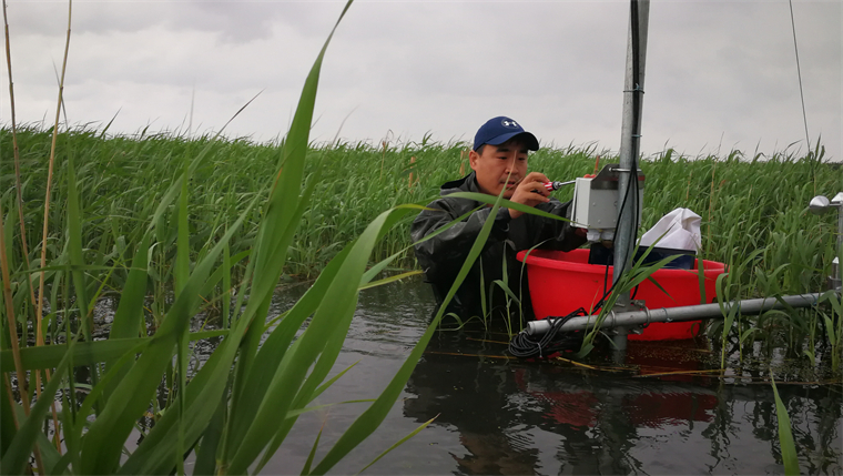 文波龍正在調(diào)試濕地生態(tài)特征和功能變化監(jiān)測裝置