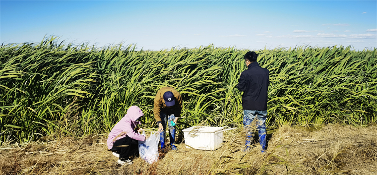 研究生在茭白地采樣