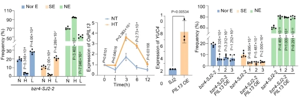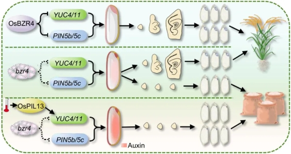 深入研究顯示,高溫能夠誘導(dǎo)植物光敏色素互作因子(PIF)家族基因OsPIL13的表達(dá),而OsPIL13又能激活生長(zhǎng)素合成基因YUC4的表達(dá),從而加劇OsBZR4功能缺失突變體中生長(zhǎng)素的過(guò)度積累,最終導(dǎo)致產(chǎn)生更高比例的無(wú)胚種子。