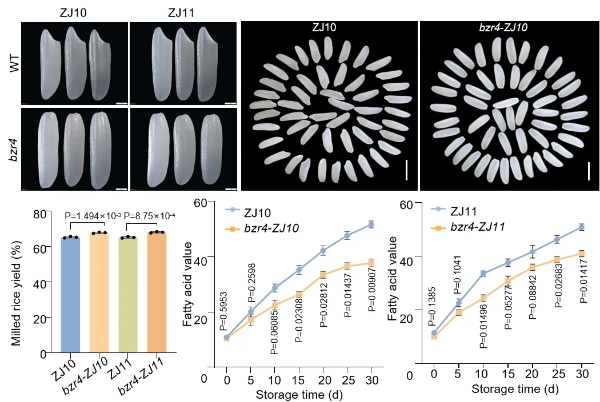 ▲OsBZR4功能缺失突變體提高水稻精米率和耐儲(chǔ)性