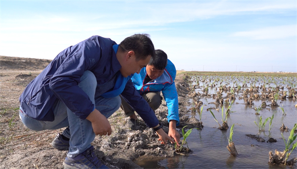 文波龍(左)與丁煒(右)在鹽堿地做實驗