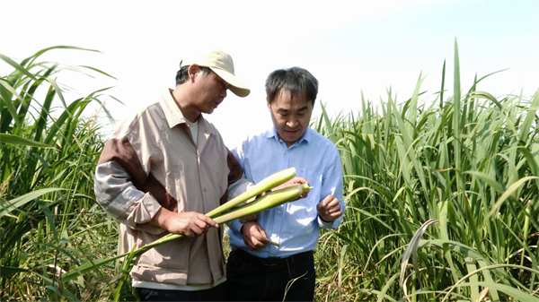 丁煒(左)與文波龍(右)探討茭白品種