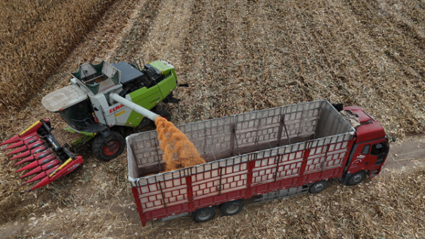 聯(lián)合收割機收獲玉米籽粒裝車運送糧倉。關(guān)永喜攝