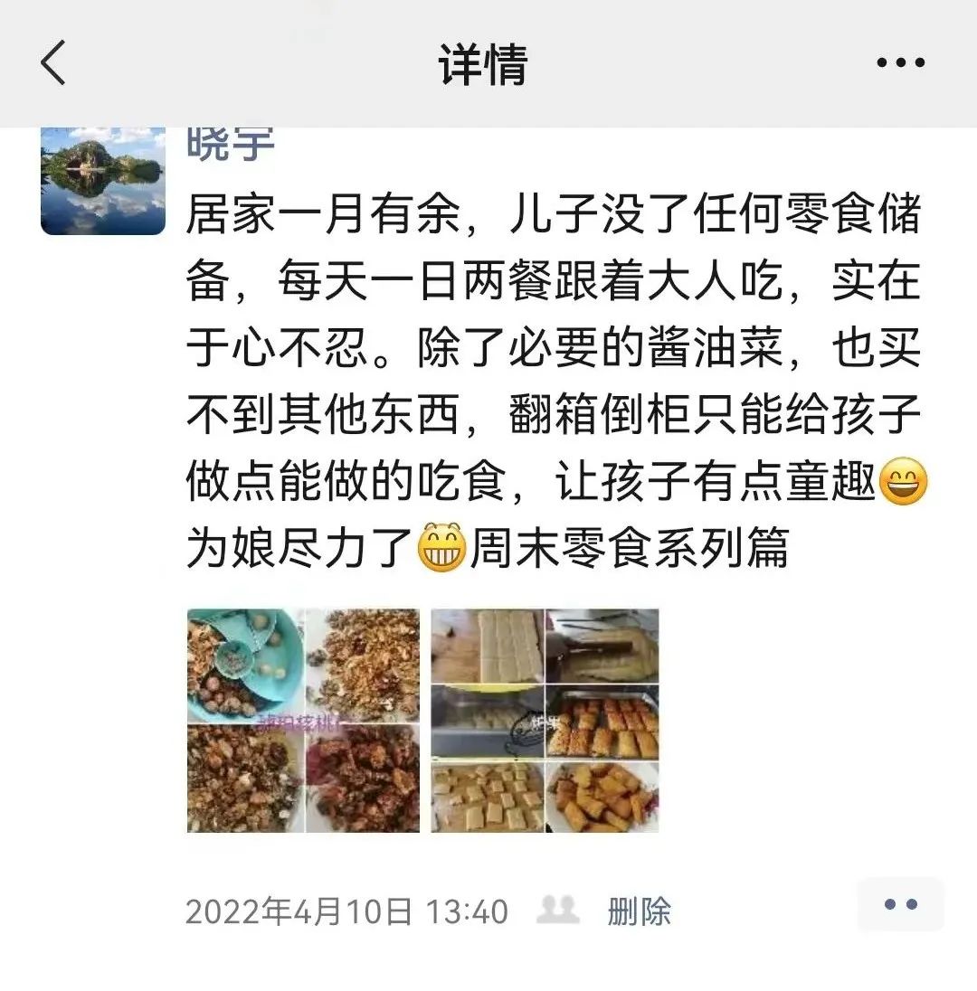 自二月九日離家以來(lái),我們每天都保持互動(dòng),曬三餐美食,我夸您的葷素搭配,您羨慕我的“不勞而獲”。所區(qū)封閉后,看到我早餐的包子、餅、小菜、粥,和午餐晚餐的一葷兩素,米飯和饅頭任選,您還感嘆能在靜態(tài)管理的長(zhǎng)春,吃到這么好的飯菜,真是非常幸福的啊。是的呢,在所里的我們就像在家長(zhǎng)庇護(hù)下的孩子,不愁吃穿,就如兒時(shí)您說(shuō)我可以在您的懷抱中沒(méi)有煩惱。