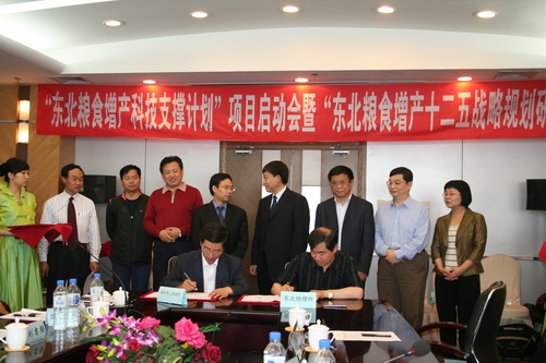 5月11日,在中科院“東北糧食增產(chǎn)科技支撐計(jì)劃”項(xiàng)目啟動(dòng)會(huì)上,我所何興元所長與黑龍江省海倫市劉忠強(qiáng)副市長簽署了《中國科學(xué)院東北地理與農(nóng)業(yè)生態(tài)研究所與黑龍江省海倫市人民政府科技合作協(xié)議》,院生物局張知彬局長、長春分院王利祥院長、黑龍江省科技廳潘忠副廳長等有關(guān)領(lǐng)導(dǎo)參加了簽約儀式。