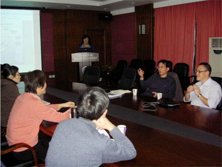 參觀實(shí)驗(yàn)室后,水文與水資源學(xué)科組全體成員與孫廣智博士就實(shí)驗(yàn)室目前承擔(dān)的科研任務(wù)和未來(lái)發(fā)展設(shè)想進(jìn)行了深入的交流和探討。唐艷凌博士和在讀博士生李紅艷結(jié)合自己的研究方向分別做了題為《退化鹽堿濕地生態(tài)補(bǔ)水機(jī)制研究》和《濕地水質(zhì)凈化機(jī)理模擬研究》的匯報(bào),孫廣智博士就濕地水質(zhì)凈化研究思路、模擬實(shí)驗(yàn)方案等方面提供了寶貴的意見和建議。本次學(xué)術(shù)活動(dòng)有助于推動(dòng)我所在濕地水質(zhì)凈化研究方面開展更加廣泛的國(guó)際合作與交流。
