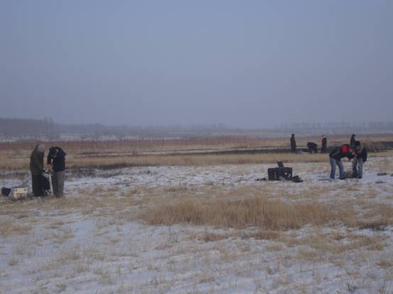 2009年~2010年的冬天格外地寒冷,皚皚白雪覆蓋了美麗的東北大地。在中國科學院知識創新重要方向性項目“土壤濕度與積雪參量高精度微波遙感反演機理研究”、國家自然科學基金項目“ 我國東北區雪蓋深度高精度被動微波遙感反演方法研究”和“非均勻條件下積雪微波輻射特性觀測理解與模擬”的支持下,中國科學院東北地理與農業生態研究所在持續開展近兩個月的戶外積雪參量遙感觀測后,聯合中國科學院寒區旱區環境與工程研究所、北京師范大學、香港中文大學、中國科學院對地觀測與數字地球科學中心和吉林大學等多家單位,由趙凱研究員領隊,一行27人,歷時8天,在吉林省的西部和東部地區,開展了野外積雪遙感聯合實驗。本次實驗的目的是在自然環境條件下,測量未經人為干預的積雪遙感信息(光學、微波),與衛星遙感數據進行比對,發展積雪參量反演模型,提高被動微波遙感反演積雪參量(厚度、面積、雪水當量)精度。