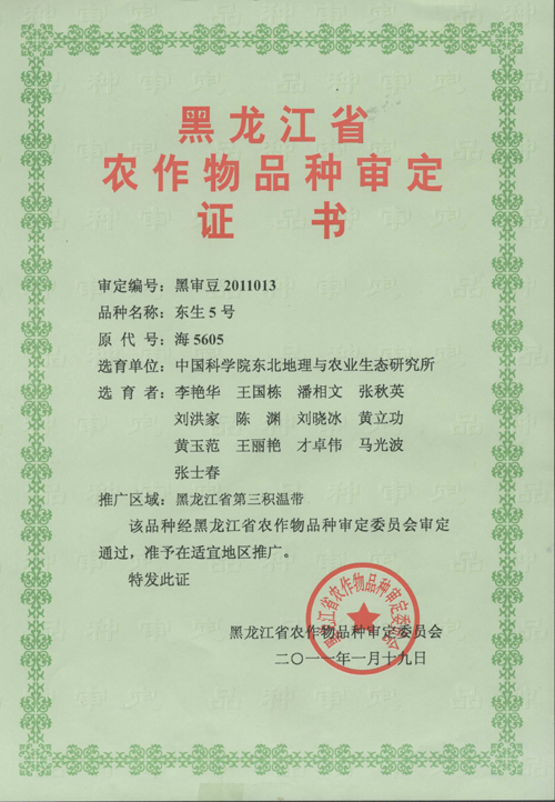 近日,我所研制的大豆新品種“東生5號”(品種審定編號:黑審豆2011013),經(jīng)“黑龍江省農(nóng)作物品種審定委員會”審定通過,準(zhǔn)予在適宜地域推廣。