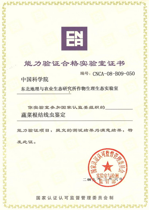 根結線蟲是一類非常重要的植物病原線蟲,幾乎危害所有農作物,尤其對蔬菜、花卉和果蔬等經濟作物危害更大,并且防治困難,被許多國家列為對外植物檢疫性有害生物。我國2007年公布的《進境植物檢疫性有害生物名錄》,根結線蟲屬(非中國種)也被列其中,要求加強邊境口岸的檢疫。開展蔬菜根結線蟲的鑒定能力驗證,對提高進出境蔬菜的檢出率,保護蔬菜生產的安全,促進農產品對外貿易有重要的意義。本次驗證項目是2008年國家認證認可監督委員會為加強實驗室能力建設而開展的計劃項目,旨在了解國內植物線蟲鑒定領域的整體水平。我所許艷麗研究員帶領的學科組參與了蔬菜根結線蟲鑒定的能力測試,提交的測試結果為滿意,為此國家認證認可監督委員會頒發了“能力驗證實驗室合格證書”,此證書標志了我所的線蟲鑒定技術為國家所認可,具有線蟲鑒定能力。