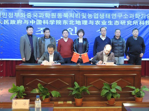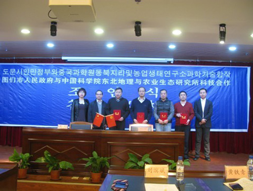 2012年12月14日上午,中國科學(xué)院東北地理與農(nóng)業(yè)生態(tài)研究所同吉林省圖們市人民政府在圖們市邊疆大廈舉行了科技合作協(xié)議簽字儀式。圖們市副市長劉濱斌和東北地理所副所長黃鐵青代表雙方簽署了合作協(xié)議。中國科學(xué)院長春分院副院長李冰、延邊州科學(xué)技術(shù)局副局長李秉生、圖們市科技局局長郭愛民等領(lǐng)導(dǎo)和東北地理所劉景雙、齊曉寧、楊福、王洋等農(nóng)業(yè)專家參加了簽字儀式。