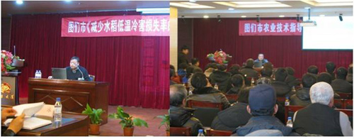 簽約儀式結(jié)束后,圖們市人民政府向我所的劉景雙研究員、齊曉寧研究員、楊福研究員、王洋研究員頒發(fā)了科技合作專家聘書。我所齊曉寧研究員和楊福研究員為圖們市農(nóng)業(yè)技術(shù)人員和廣大農(nóng)戶代表做了水稻新型種植技術(shù)和高產(chǎn)水稻新品種的專題報告,參會人員和農(nóng)戶代表仔細(xì)聽取了報告。