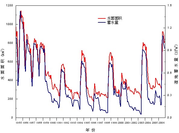 圖1 1985-2006年各月濕地水面面積和蓄水量的變化