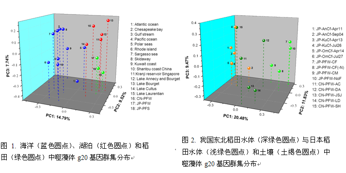 我所農田分子生態學科組前期研究結果發現,我國東北稻田T4型噬菌體g23基因(編碼主要殼蛋白基因)分布與日本稻田存在一定的差異,兩國間各有一些特殊的類群被發現;同時也發現,基于g23基因群集表征的T4型噬菌體群落結構在稻田、海洋和湖泊環境中明顯不同,據此認為T4型噬菌體群落結構分布受到地理環境和生態過程的雙重影響,而對于其它噬菌體遺傳基因的分布是否也具有相似的規律還未明晰。為此,東北地理與農業生態研究所的博士研究生荊瑞勇在王光華研究員指導下,對東北5個樣點的稻田田面水中噬藻體g20基因分布規律進行了調查。研究結果發現,我國東北稻田水體存在3個新的g20基因類群(PFW-VII~-IX);采用UniFrac方法分析噬藻體g20基因群集發現,噬藻體群落結構在海洋、湖泊及稻田環境中存在顯著的差異(圖1),即使在相同的稻田水體環境中,我國東北稻田水體和日本稻田水體中的噬藻體群落結構也不同(圖2)。該研究結果進一步證明了噬藻體g20基因分布也受到地理環境和生態過程的影響。
