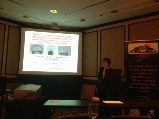 王從麗研究員提交的兩個(gè)摘要均被選上做分會(huì)報(bào)告,分別是“Pluronic gel, a useful medium to study entomopathogenic nematode host habitat finding behavior in response to environmental cues from plant”和“Transgressive segregation of root-knot nematode resistance in cotton determined by QTL analysis”。向線蟲界專家報(bào)告了我所在昆蟲病原線蟲領(lǐng)域研究取得的新進(jìn)展以及棉花抗根結(jié)線蟲的超親分離遺傳機(jī)理方面的研究進(jìn)展。