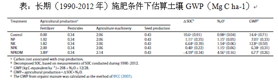 結(jié)果表明:在目前種植制度下,長期施用化肥導(dǎo)致土壤有機(jī)碳下降,增加了GWP。長期化肥配施有機(jī)肥NPKOM處理,土壤有機(jī)碳含量增加了4.59Mg ha-1,但是并沒有降低GWP。與其它施肥相比,化肥配施有機(jī)肥NPKOM增加N2O排放,平均增加2.9倍。NPKOM處理GWP(6.77 Mg C)與NP和NPK處理相比差異不顯著,但是顯著低于CK處理(14.4 Mg C)和NK處理(12.8 Mg C)。這表明,在中國東北黑土地區(qū),在雨養(yǎng)農(nóng)業(yè)生產(chǎn)條件下,化肥配施有機(jī)肥即增加作物產(chǎn)量,培肥地力,又降低GWP。這項結(jié)果將為黑土地區(qū)農(nóng)業(yè)生產(chǎn)合理施肥提供科學(xué)依據(jù)。