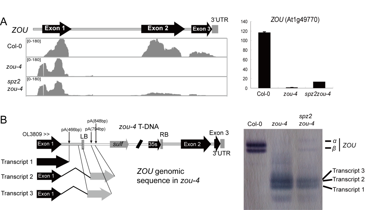 圖.SPZ2/FPA基因突變導致T-DNA通讀并恢復zou-4突變體中ZOU基因表達