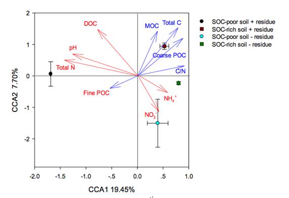為此,東北地理所農(nóng)田分子生態(tài)學(xué)科組連騰祥博士在金劍研究員的指導(dǎo)下,采用13C標(biāo)記示蹤技術(shù),在明確大豆根殘體向黑土土壤碳庫歸還量大于莖和葉殘體的基礎(chǔ)上(Lian et al., 2016, Biology and Fertility of Soils),進(jìn)一步解析了13C標(biāo)記的大豆莖稈殘體向低、高有機(jī)質(zhì)含量黑土(SOC含量分別為14和50 g/kg)的轉(zhuǎn)化情況。研究發(fā)現(xiàn)秸稈碳轉(zhuǎn)化在不同有機(jī)質(zhì)含量黑土中存在明顯分異。相同量的秸稈碳向有機(jī)質(zhì)含量高的黑土各有機(jī)碳庫(粗顆粒有機(jī)碳、細(xì)顆粒有機(jī)碳和礦物結(jié)合有機(jī)碳)貢獻(xiàn)量顯著高于低有機(jī)質(zhì)含量的黑土;此外,秸稈還田對土壤固有有機(jī)碳產(chǎn)生了激發(fā)效應(yīng),其效應(yīng)在低有機(jī)質(zhì)含量的黑土上體現(xiàn)更為顯著;同時采用高通量測序技術(shù)分析了秸稈添加對黑土土壤微生物群落結(jié)構(gòu)的影響,在屬以及OTU水平上揭示了土壤碳庫變化與微生物群落結(jié)構(gòu)的響應(yīng)關(guān)系(圖1);發(fā)現(xiàn)在低有機(jī)質(zhì)含量黑土中,Verrucosispora、Xanthomonadales和Steroidobacter對秸稈還田響應(yīng)顯著,而在高有機(jī)質(zhì)含量黑土中,Anaerolineaceae_uncultured是主要的響應(yīng)菌屬。另外,土壤微生物群落結(jié)構(gòu)與碳沉積等因子的典范對應(yīng)(CCA)分析揭示了土壤細(xì)菌群落結(jié)構(gòu)與不同SOC碳庫的關(guān)聯(lián)(圖2)。此項研究成果為黑土區(qū)的秸稈還田策略和秸稈碳轉(zhuǎn)化機(jī)制研究提供了重要的指導(dǎo)作用。研究結(jié)果發(fā)表在國際期刊Biology and Fertility of Soils和Soil Biology & Biochemistry上。