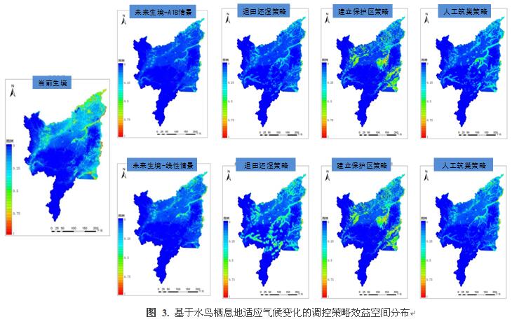1.研究團隊(1)首次構建了針對濕地水鳥應對氣候變化策略的理論研究框架(圖1);(2)揭示了當今和未來氣候變化情景下東北地區三江平原東方白鸛棲息地適宜性的空間分布格局(圖2),表明未來氣候情境下棲息地適宜性分布面積嚴重下降;(3)揭示了不同氣候適應性策略對棲息地應對氣候變化的效益(圖3),研究顯示“退耕還濕”是最有效的適應性對策,可以使適宜性生境面積提高十倍以上;“建立自然保護區”可以提高生境適宜性六倍以上;“人工筑巢”可以提高生境適宜性二倍以上。