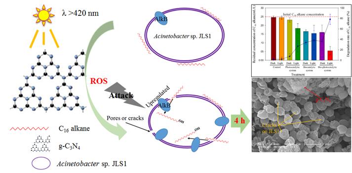 石油污染是當(dāng)今世界亟待解決的環(huán)境污染問題之一,東北地理所環(huán)境修復(fù)材料與技術(shù)學(xué)科組于洪文、徐興健等研究人員,針對(duì)石油污染修復(fù)研究的理論與技術(shù)需求,利用從吉林油田污染土壤中篩選出的石油烴降解菌Acinetobacter sp. JLS1和環(huán)境友好型光催化劑g-C3N4,成功構(gòu)建了用于石油烴高效降解的生物-光催化耦聯(lián)修復(fù)系統(tǒng)(Bio-photocatalytic hybrid system),研究并明確了該系統(tǒng)對(duì)石油烴組分中正十六烷(C16alkane)的降解性能及相關(guān)機(jī)制。
