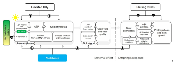 圖:褪黑素參與小麥葉綠素b缺失突變體親本植株對大氣二氧化碳增高的響應,并對后代小麥植株的低溫抗性具有促進作用。