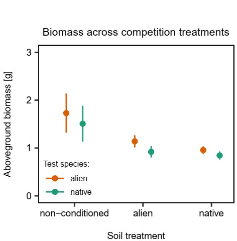 圖2 土壤馴化對外來植物(橘色)和本地植物(紫色)平均生物量的影響。 高平均生物量代表更高競爭能力。在外來植物馴化的土壤上,后來的外來植物平均生物量高于后來的本地植物。