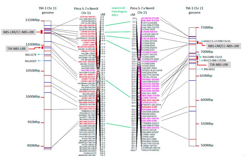 圖1:棉花TM1物理圖譜和RIL(PimaS-7xNemX)群體形成的遺傳圖譜比對。紅色的SSR分子標記表示被定位到TM1-Chr11,粉色的SSR表示被定位到TM1-Chr21。