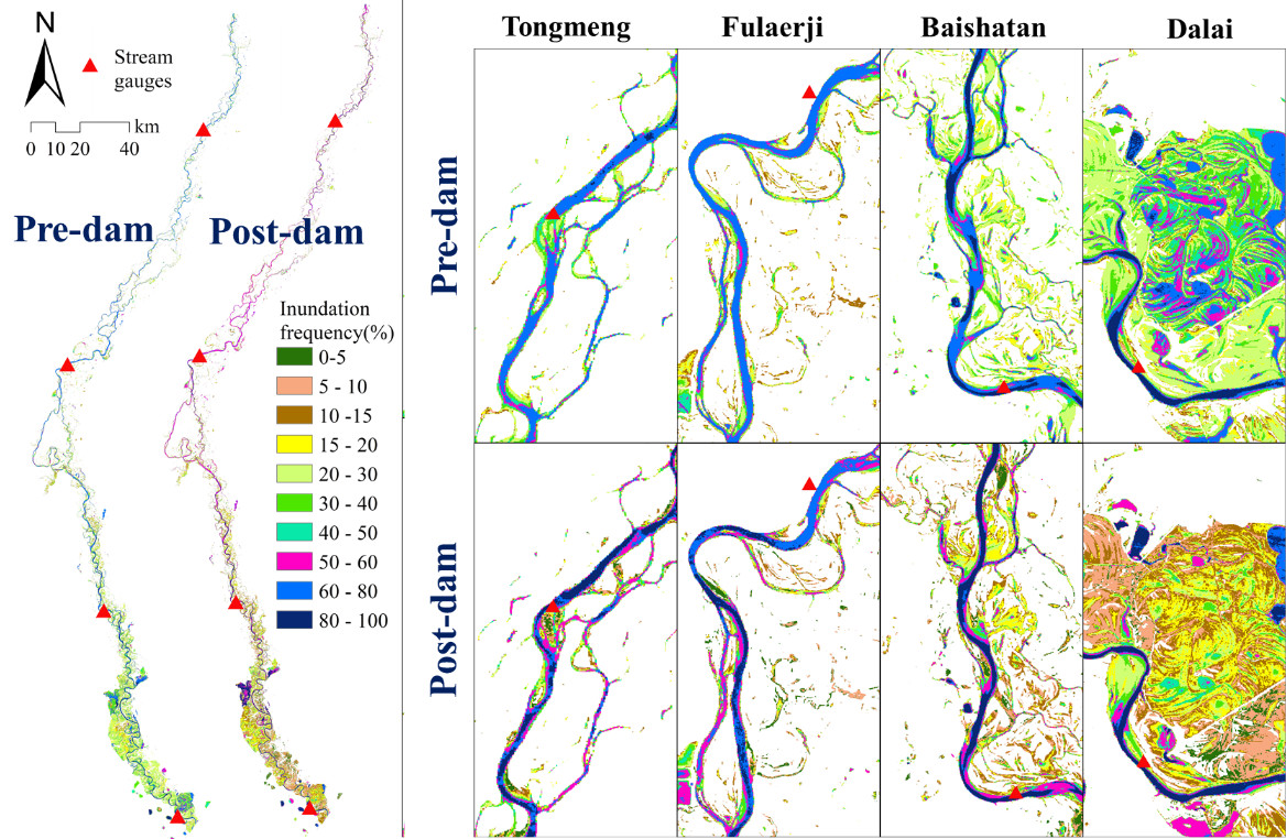 河濱濕地在維系流域水安全和生態(tài)安全等方面發(fā)揮著極為重要作用。水庫大壩在為全球社會經(jīng)濟(jì)發(fā)展起到重要支撐作用的同時(shí),也對河濱濕地生態(tài)系統(tǒng)施加了巨大的干擾,是引起河濱濕地面積萎縮、功能退化甚至喪失等的主要因素之一。洪水脈沖在維系河濱濕地生態(tài)系統(tǒng)健康中發(fā)揮著極為重要的作用。如何從洪水脈沖視角定量揭示水庫大壩對下游河濱濕地的影響成為濕地退化水文學(xué)機(jī)制研究的關(guān)鍵科學(xué)問題。為此,東北地理所水文與水資源學(xué)科組科研人員選擇嫩江尼爾基水庫下游為研究區(qū),基于多情境下河濱濕地—河道水文交互過程模擬和遙感淹沒分析,定量闡明了水庫大壩建設(shè)對下游河濱濕地淹沒頻率和洪水脈沖強(qiáng)度的影響,并提出了維持河濱濕地生態(tài)健康的洪水脈沖機(jī)制可為流域濕地水文調(diào)控和水資源調(diào)度提供重要理論支撐。