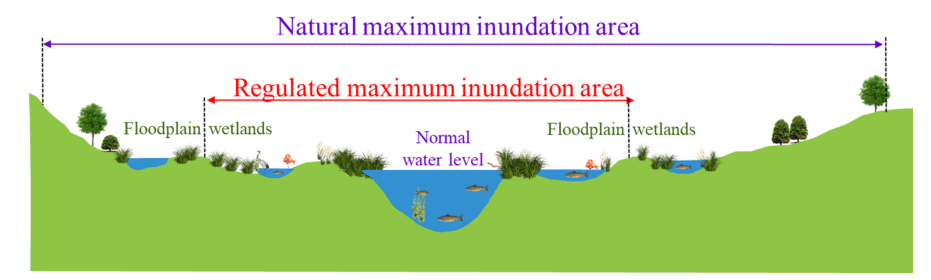 圖3 自然和水庫大壩建設(shè)情境下河濱濕地淹沒面積變化的概念圖