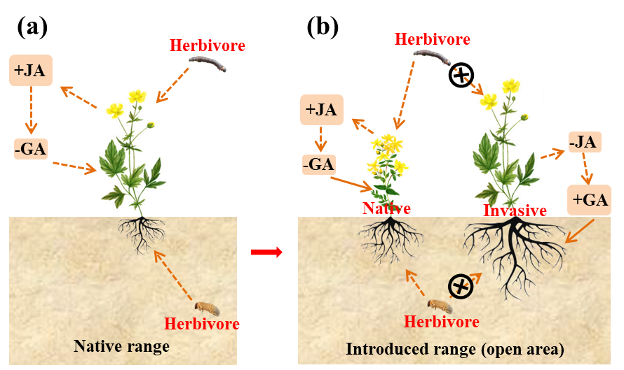 植物體內(nèi)諸多激素能夠調(diào)控自身的生長發(fā)育、以及對(duì)天敵的防御。其中,赤霉素和茉莉酸是非常重要的一對(duì)拮抗調(diào)控植物生長和防御的激素。基于此認(rèn)知,結(jié)合天敵逃逸假說,生物入侵生態(tài)學(xué)學(xué)科組劉艷杰研究員(第一作者)與臺(tái)州學(xué)院于飛海教授(通訊作者)從激素調(diào)控外來植物生長和防御權(quán)衡方面提出一個(gè)新的概念模型(圖1)——由于入侵植物在引入地逃逸掉許多專食性天敵采食,其茉莉酸途徑會(huì)下調(diào)降低植物防御投資,赤霉素途徑上調(diào)提高生長投資;而由于受到更多天敵采食,本地植物則茉莉酸途徑上調(diào)增加防御,赤霉素途徑下調(diào)減小生長。因此,入侵植物比本地植物更具生長優(yōu)勢(shì)。