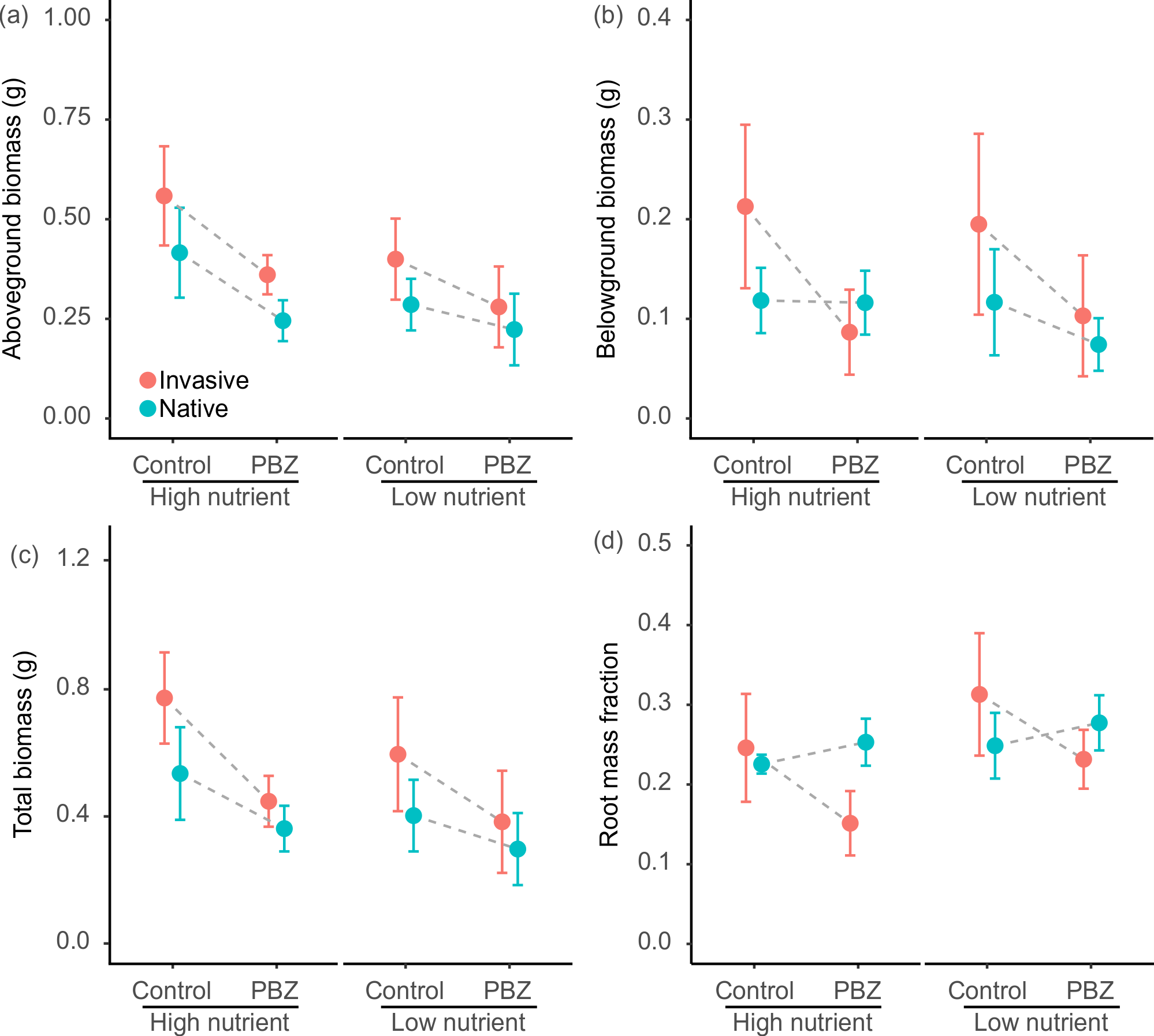 圖2 不同水平多效唑(PBZ:赤霉素合成抑制劑)和養(yǎng)分處理對(duì)入侵植物和本地植物(a) 地上生物量,(b) 地下生物量,(c) 總生物量,和 (d) 根質(zhì)量分?jǐn)?shù)的影響