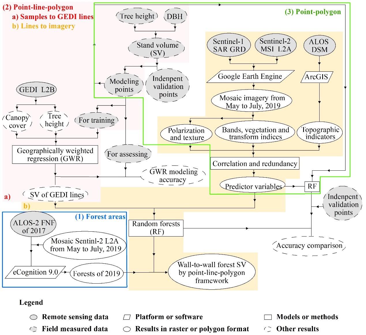 中科院東北地理所地理景觀遙感學(xué)科組研究人員利用近期發(fā)布的星載GEDI 激光雷達(dá)足跡數(shù)據(jù)、Sentinel系列衛(wèi)星C波段雷達(dá)和可見光影像、ALOS衛(wèi)星L波段干涉雷達(dá)影像DSM產(chǎn)品,結(jié)合學(xué)科組在長白山混交林區(qū)積累的大量野外調(diào)查數(shù)據(jù),深入分析了不同遙感數(shù)據(jù)源及其特征因子(如冠層覆蓋度、樹高、后向散射、紋理、植被生理、地形等)對森林蓄積量空間變異的敏感性差異,構(gòu)建了區(qū)域尺度森林蓄積量高精度遙感反演模型,實現(xiàn)了2019年長白山混交林區(qū)森林蓄積量制圖(10米空間分辨率),并提出了面向森林質(zhì)量提升目標(biāo)的可持續(xù)管理建議。