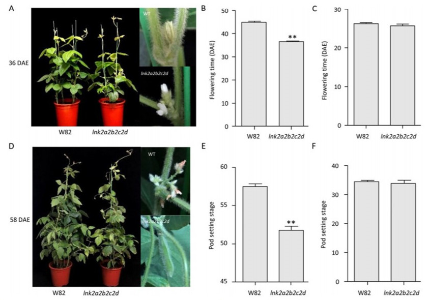 李趙博博士利用全基因組關(guān)聯(lián)分析(Genome-wide association studies, GWAS)技術(shù)與擬南芥重要生物鐘基因進行同源比對的方法,在大豆中鑒定到一調(diào)控開花期新基因LNK2 (Night light-inducible and clock-regulated 2)。利用CRISPR/Cas9開發(fā)出LNK2基因的轉(zhuǎn)基因四重純合突變體,在長日照條件下,四重突變體的開花時間明顯早于野生型(圖2)。熒光定量PCR顯示,在長日照條件下,LNK2的轉(zhuǎn)錄水平明顯低于野生型。LNK2促進了豆類特異性E1基因的表達,并抑制了開花素FT2a的表達。這些結(jié)果表明,CRISPR/CAs9介導(dǎo)的4個LNK2基因的靶向突變縮短了大豆的開花時間。