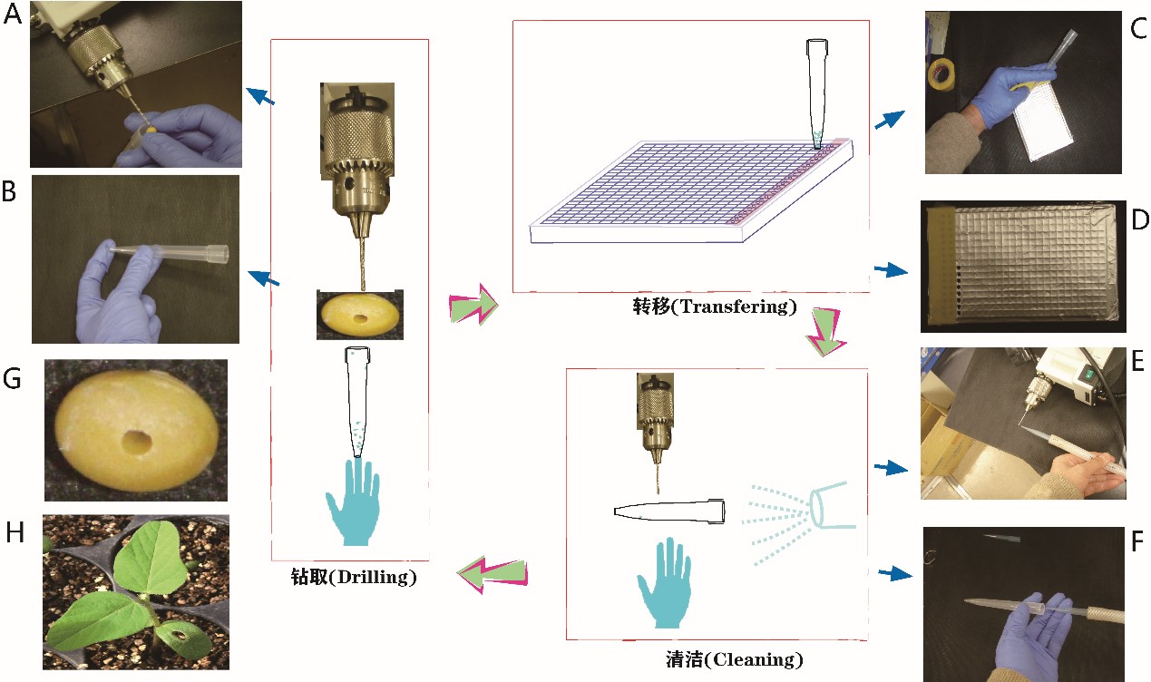 圖1 種子鉆孔和樣品采集過程。中間部分為整體流程簡圖, 種子取樣經鉆取、轉移及清潔3個部分, 然后再進入下一個種子的鉆取。 (A)–(B) 種子鉆?。?(A)種子組織的鉆取, (B) 移液槍頭收集種子組織; (C)–(D) 種子樣品的轉移: (C) 鉆取的種子組織轉移至384深孔板中, (D) 一行轉移后貼膠帶保護; (E)–(F) 清潔: (E) 鉆頭的清潔, (F) 移液槍頭及手套的清潔; (G) 鉆孔后的大豆種子; (H) 鉆孔豆種子播種后14天的幼苗