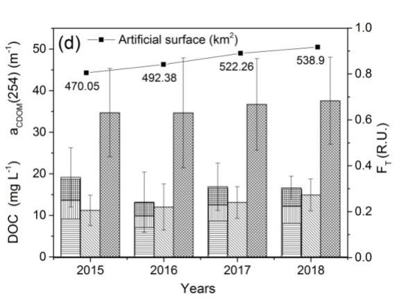 由于DOM的組分復雜且難以分離,目前多使用光譜代理參數(shù)如某波段的吸收系數(shù)aCDOM(440)、光譜斜率S275-295、M值及特征吸收SUVA(254)來表征其濃度,指示其來源、芳香性和分子量大小。近年來,隨著三維熒光技術(EEMs)及其譜圖識別技術的發(fā)展,為識別DOM組分開辟了新思路。先后出現(xiàn)了尋峰法、平行因子法(PARAFAC)、面積積分法(FRI)來識別DOM的組分并確定其來源。因此,中國科學院東北地理與農(nóng)業(yè)生態(tài)研究所水環(huán)境遙感學科組的科研人員自2015年至2018年長達四年時間,定點監(jiān)測采集了長春市區(qū)內(nèi)15個城市水體及8個周邊非城市水體,共計獲取398個實測DOM數(shù)據(jù),借助三維熒光及平行因子技術對比分析了城市水體DOM的光學及組分特征,追溯了其來源,同時研究了DOM的年內(nèi)季節(jié)變化及年際變化。研究結(jié)果表明,城市水體和非城市水體DOM均受陸源輸入影響較大,其中城市水體水質(zhì)較差多呈現(xiàn)富營養(yǎng)化,且城市水體DOM濃度明顯高于非城市水體(11.12 ± 5.36 mg L-1 > 7.46 ± 2.62 mg L-1),其蛋白類組分豐度也明顯高于非城市水體(26% > 21.3%)。此外,我們還發(fā)現(xiàn)DOM在夏季具有較高濃度由于其強降雨和藻類生長的雙重作用,且隨著城市建成區(qū)面積的擴張DOM濃度也略有升高,這些發(fā)現(xiàn)填補了城市范圍內(nèi)水-陸相互作用下的DOM特征及變化研究的空白,也說明城市水體受到人為因素干擾已日趨惡化,在此呼吁廣大居民應提高環(huán)保意識,守護我們的藍天綠水,同時本研究也為城市水環(huán)境監(jiān)測和管理提供了技術支撐。