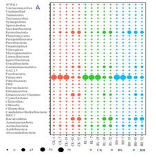中科院東北地理所水環(huán)境污染與防治學(xué)科組以畜禽糞便好氧堆肥過程中重金屬為研究對象,系統(tǒng)的分析堆肥過程中重金屬的形態(tài)變化關(guān)鍵影響機制。研究結(jié)果表明,不同堆肥工藝條件下(不同碳氮比和不同物料配比),有機質(zhì)是影響重金屬形態(tài)再分配的關(guān)鍵影響因子;為強化重金屬的鈍化效果,篩選了物理化學(xué)型鈍化劑(生物炭和沸石)和營養(yǎng)型鈍化劑(硼泥和磷礦粉),均可提高重金屬的鈍化效率(2%-40%),其中鈍化效果對于不同的金屬作用不一:Cu>Cd>Pb>Zn>Cr。生物炭改變高溫期微生物群落,直接或者間接地影響重金屬的生物可利用性(圖1.A);磷礦粉通過增加可溶性磷濃度,進而改變堆肥高溫期菌群結(jié)構(gòu),促進堆肥的腐殖化過程而改變重金屬的生物可利用性(圖1.B);不同粒徑的外源添加劑可通過增加吸附比表面積和改善堆體孔隙結(jié)構(gòu),影響堆肥重金屬的鈍化效果;大顆粒的添加劑通過改善堆體孔隙結(jié)構(gòu),促進腐殖質(zhì)的生成而強化了重金屬的鈍化效率,這也表明堆肥中外源添加劑的作用主要依靠有機質(zhì)對重金屬的結(jié)合固定而非表面吸附沉淀的作用(圖2)。