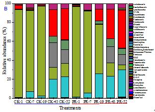 圖1 外源添加劑對堆肥微生物群落結(jié)構(gòu)影響(A:生物炭添加;B:磷礦粉添加)