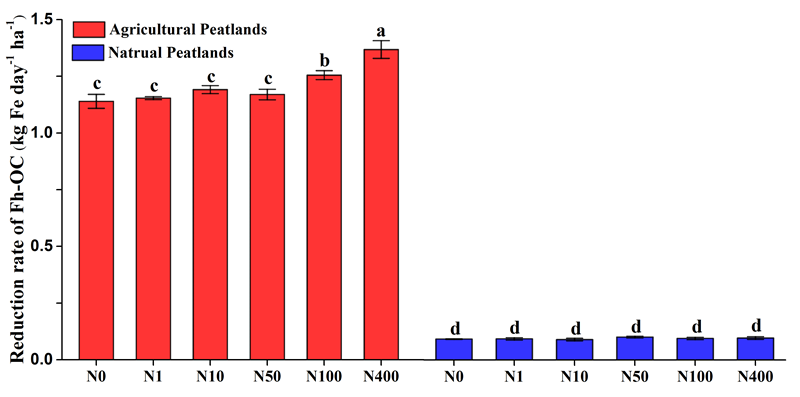 鐵作為泥炭沼澤有機碳輸出的重要載體,認識鐵還原機制對理解泥炭地有機碳輸出具有重要意義。通過模擬實驗發現,高氮處理(100與400mgkg-1)顯著改變了墾殖泥炭地土壤鐵還原菌群落組成、增加鐵還原菌豐度,導致鐵還原量顯著高于低氮處理(0.09-0.2kgFeday-1ha-1),而且墾殖泥炭地鐵還原量遠遠高于天然泥炭地(圖2)。增加的可溶性鐵能夠與酚類物質形成相對穩定的可溶性復合物,潛在地促進墾殖泥炭地鐵與有機碳持續輸出。