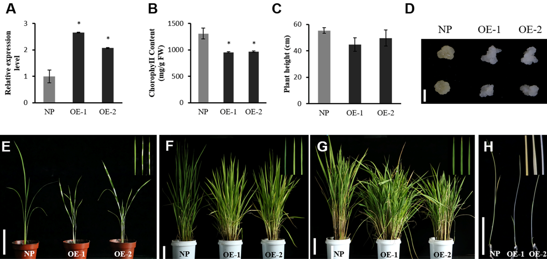 (A) 野生型植株與超量表達(dá)植株中OsOR基因的表達(dá)量分析。(B) 葉片中葉綠素含量檢測(cè)。(C) 野生型植株與超量表達(dá)植株的株高分析。(D) 野生型與超量表達(dá)OsOR基因的愈傷組織表型分析。(E) 分蘗早期表型分析。 (F)分蘗晚期表型分析。(G) 成熟期表型分析。(H) 暗處理下表型分析。