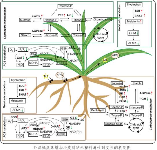 東北地理所作物生理與栽培學(xué)科組研究人員以小麥為研究對(duì)象,針對(duì)褪黑素影響聚苯乙烯納米微粒吸收、轉(zhuǎn)運(yùn)及生理作用進(jìn)行了研究。借助激光共聚焦和掃描電鏡觀察發(fā)現(xiàn),聚苯乙烯納米微粒可以被小麥根系吸收,并且當(dāng)小麥根系暴露于褪黑素和聚苯乙烯納米微粒的混合溶液中時(shí),小麥葉片和根系中聚苯乙烯納米微粒的積累量減少。RT-qPCR分析表明,外源褪黑素能夠調(diào)節(jié)葉片中水通道蛋白相關(guān)基因TIP2-9、PIP2、PIP3和PIP1.2的表達(dá)以及根系中TIP2-9、PIP1-5、PIP2和PIP1.2的表達(dá)。針對(duì)褪黑素處理減少聚苯乙烯納米微粒對(duì)小麥影響的生理機(jī)制,研究人員從內(nèi)源褪黑素代謝、碳水化合物代謝、活性氧代謝等三個(gè)方面對(duì)暴露于聚苯乙烯納米微粒的小麥葉片和根系進(jìn)行進(jìn)一步的分析。結(jié)果表明,施加的外源褪黑素參與小麥植株對(duì)聚苯乙烯納米微粒的響應(yīng),但不依賴于內(nèi)源褪黑素代謝;同時(shí),外源褪黑素施加還可以通過(guò)改變多種抗氧化酶活性(包括CAT、GST、APX、MDHAR、DHAR、GR和SOD)維持聚苯乙烯納米微粒造成的氧化脅迫下小麥的氧化還原穩(wěn)態(tài)平衡,并且通過(guò)改變碳水化合物代謝水平,保證小麥生長(zhǎng)所需的物質(zhì)和能量供應(yīng),從而增強(qiáng)植株對(duì)聚苯乙烯納米微粒毒性的耐受性。